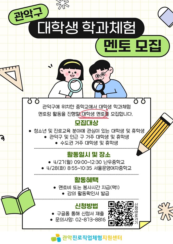 [관악진로직업체험지원센터] 4월 대학생 학과체험 멘토 모집