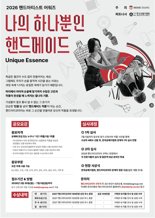 - 2차 심사 : 2026 핸드아티코리아 코엑스 현장에서 전문가 심사 및 참관객 대상 온라인 투표