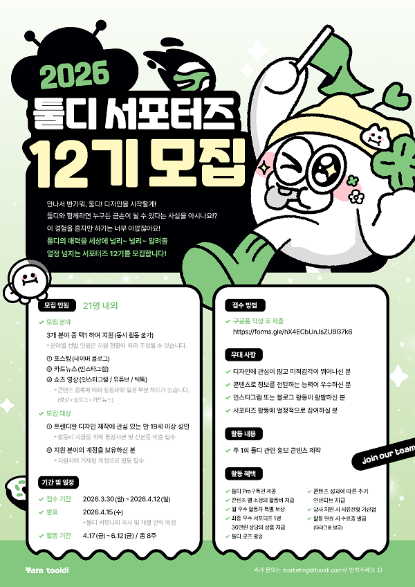 [타라티피에스] 툴디 서포터즈 12기 모집(~26/4/12)
