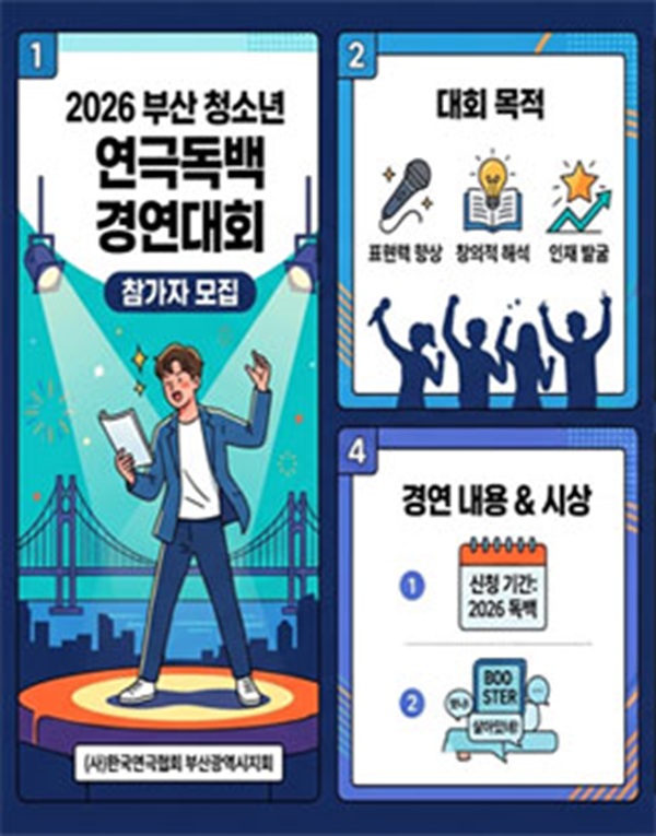미래 연극계를 이끌어 갈 인재를 발굴·육성하기 위하여 다음과 같이 「2026 부산 청소년 연극독백 경연대회」 참가자를 모집합니다.