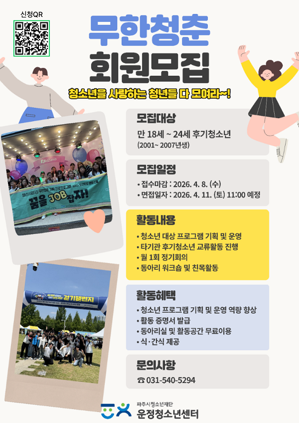 ![[파주시청소년재단 운정청소년센터] 2026년 청년 서포터즈 '무한 청춘' 신규 회원 모집(~4/8)](https://api.momitory.com/uploads/455/2/20260401_091641028.png)