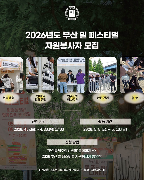- 지원방법 : 부산축제조직위원회 홈페이지 -> 2026 부산 밀 페스티벌 자원봉사 배너