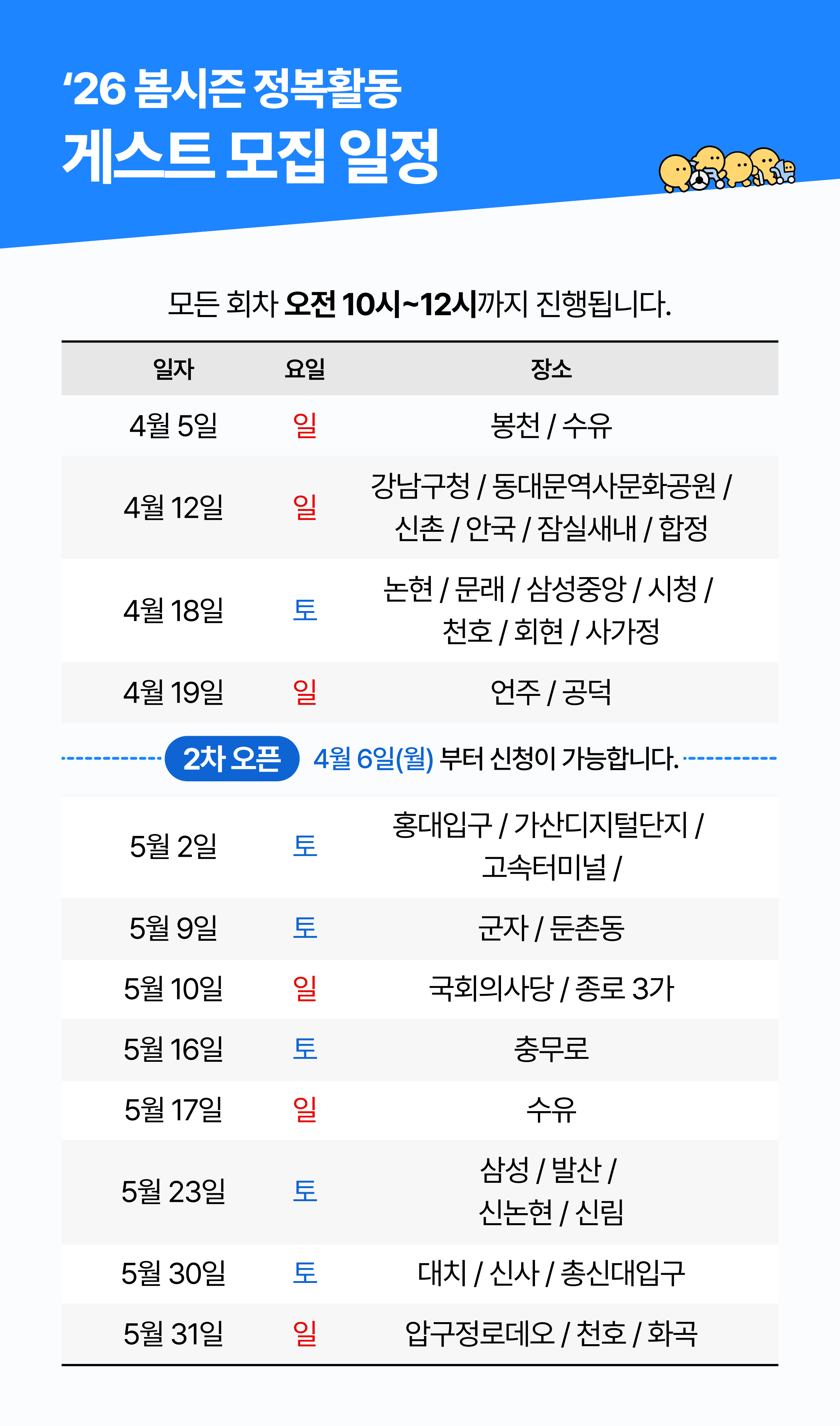 - 4월 12일 (일): 강남구청 / 동대문역사문화공원 / 신촌 / 안국 / 잠실새내 / 합정