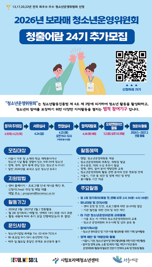 ![[청소년 정책,참여 분야] 2026년 보라매 청소년운영위원회 청출어람 24기 신규위원 모집](https://api.momitory.com/uploads/455/2/20260410_092734597.jpg)