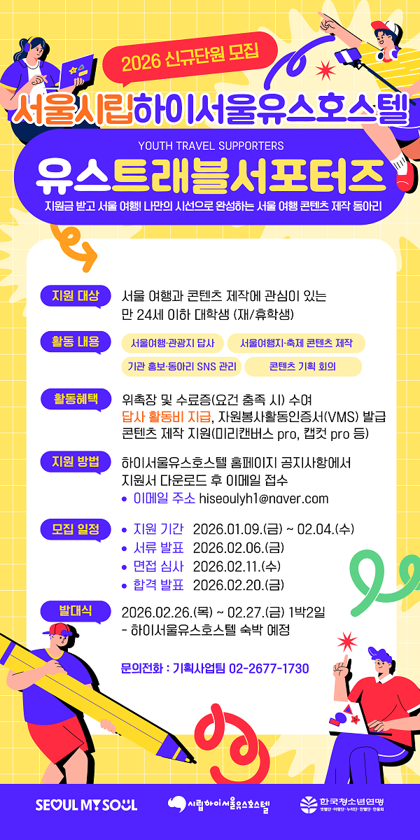 ![[시립하이서울유스호스텔]2026년 서울 여행 콘텐츠 기획·제작 동아리 '유스트래블서포터즈' 4기 모집(~2.4.(수)까지)](https://api.momitory.com/uploads/455/2/20260109_131157969.png)