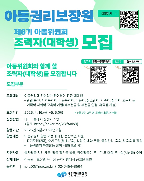 [아동권리보장원] 2026년 제6기 아동위원회 조력자 모집 안내(~5.5.(화))