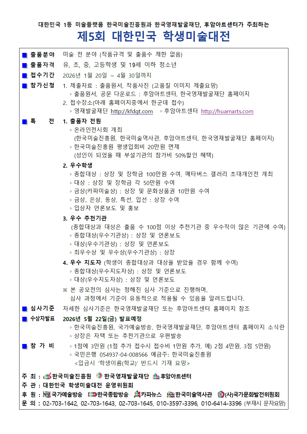 (한국미술진흥원, 한국미술역사관, 후암아트센터, 한국영재발굴재단 홈페이지)