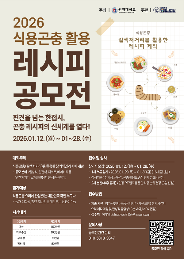- 공모 분야: 일상식, 간편식, 디저트, 베이커리 등 '갈색저거리'곤충 소재를 활용한 전 식품군(택1)