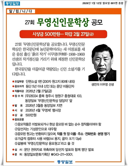 - (우)28334 충북 청주시 청원구 충청대로 103. 동양일보 ‘무영신인문학상 담당자’ 앞
