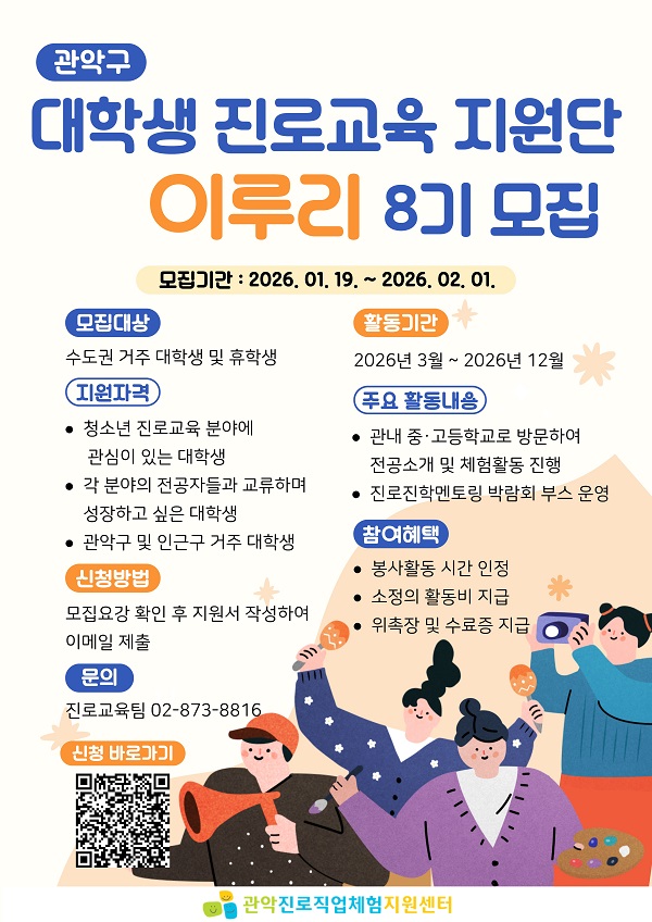 ![[관악진로직업체험지원센터] 대학생 진로교육 지원단 이루리 8기 모집](https://api.momitory.com/uploads/455/2/20260119_113232745.jpg)
