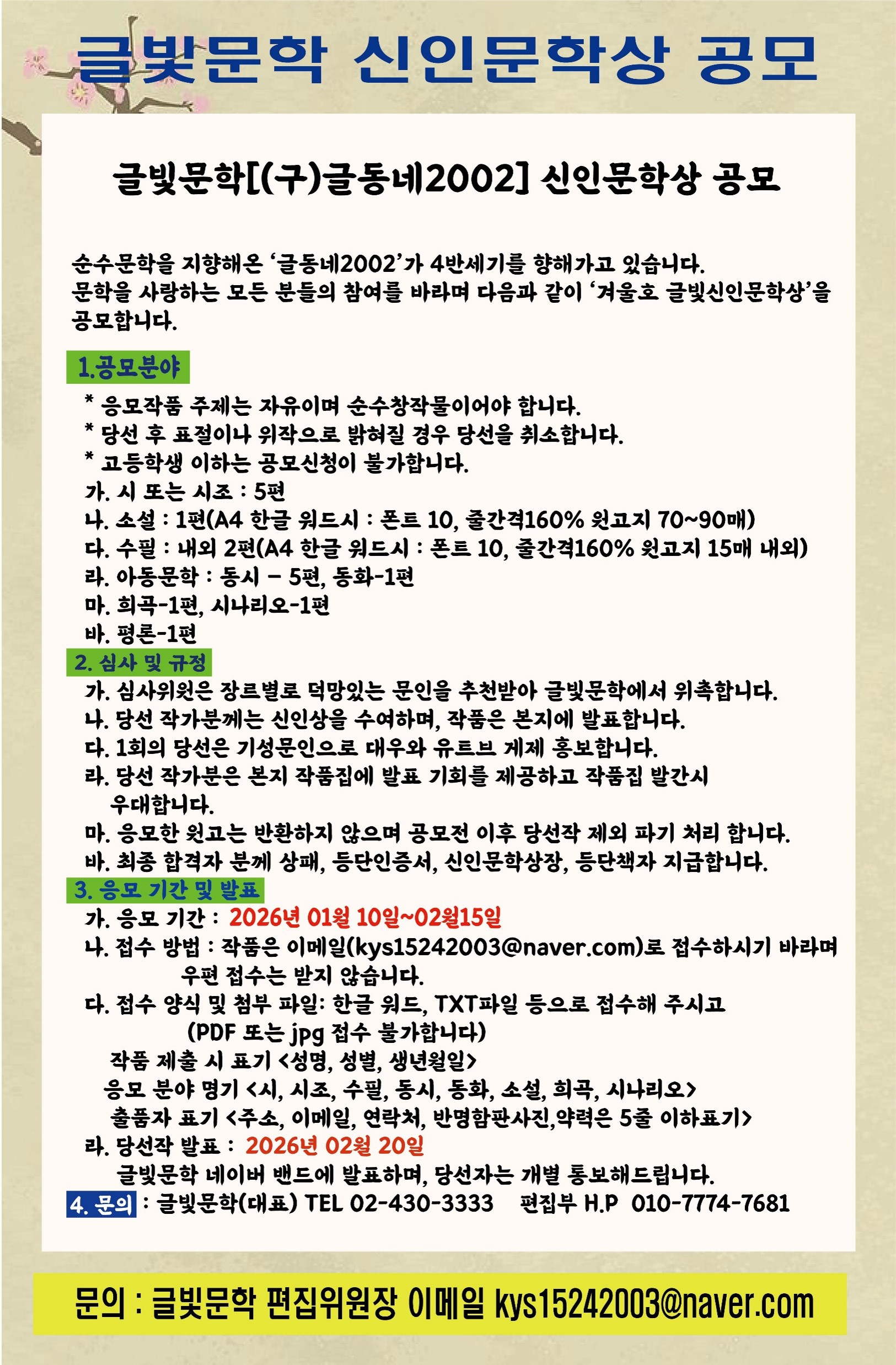![글빛문학[(구)글동네2002] 신인문학상공모](https://api.momitory.com/uploads/81/2/20260120_084419271.jpg)