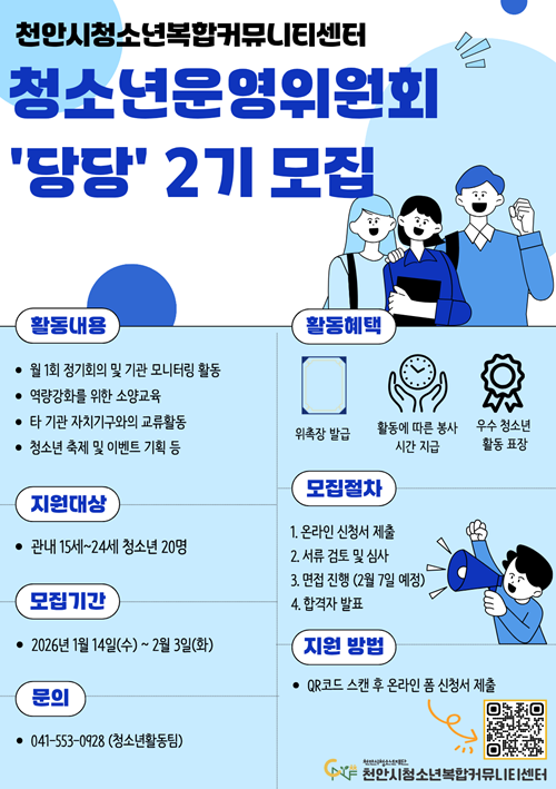 - 면접심사: 2026. 2. 7.(토) 10:00 천안시청소년복합커뮤니티센터(불당19로 82)