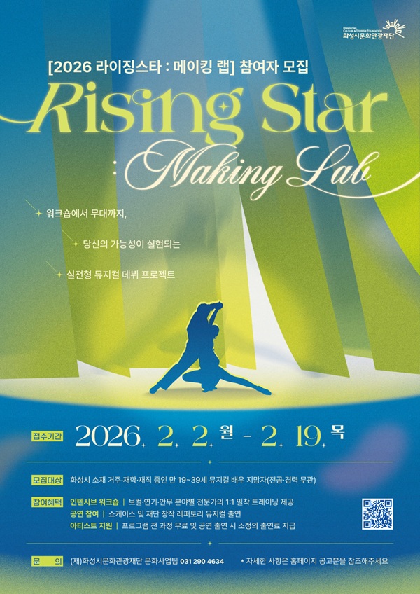 ※ 본 페이지의 정보는 참고용이며, 정확한 내용은 주최사 홈페이지의 공모요강을 통해 반드시 확인해 주세요.[2026 라이징스타: 메이킹 랩]은 뮤지컬 및 음악극 분야에 잠재력 있는 시민을 발굴하여 전문적인 트레이닝부터 무대 실연까지 지원하는 프로젝트입니다. (재)화성시문화관광재단과 함께 꿈의 무대를 만들어갈 역량있는 시민 여러분의 많은 관심과 참여 바랍니다.
