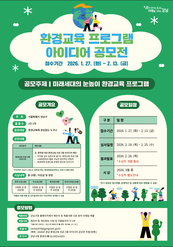 - 일정 : 접수(1.27. ~ 2.13.) → 심사(2.19. ~ 25.) → 수상작 발표(2.26. / 개별통보) → 시상(3월 중 / 별도 안내)