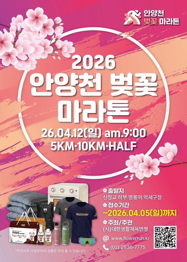 ※ 본 페이지의 정보는 참고용이며, 정확한 내용은 주최사 홈페이지의 공모요강을 통해 반드시 확인해 주세요.본 대회는 러너들이 가장 사랑하는 코스 중 하나인 안양천변을 따라, 흐드러지게 핀 벚꽃 사이를 달리는 최고의 봄 축제입니다.