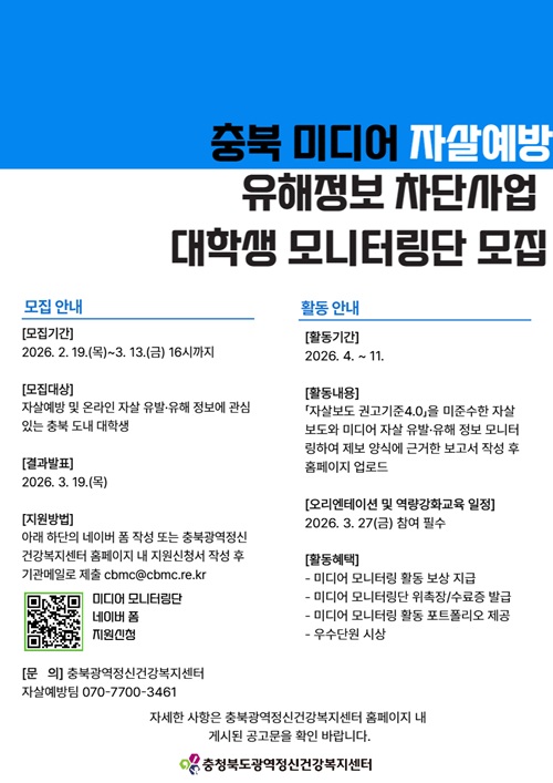 - 모집대상 : 자살예방 및 온라인 자살 유발·유해 정보에 관심 있는 충북 도내 대학생 (재학생 및 휴학생)