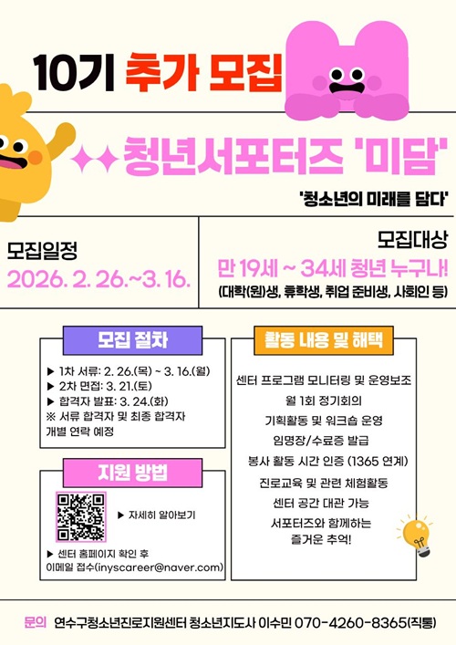 ![[연수구청소년진로지원센터] 청년서포터즈 '미담' 10기 추가 모집](https://api.momitory.com/uploads/455/2/20260227_102601918.jpg)