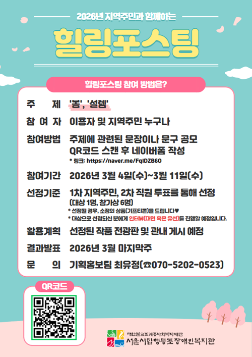 ![[서울시립영등포장애인복지관] 2026년 지역주민과 함께하는 제1회 힐링포스팅](https://api.momitory.com/uploads/81/2/20260304_102702361.png)