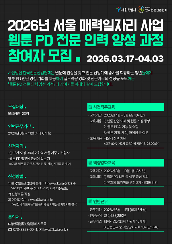 - 서울 및 수도권 웹툰 기업으로 6개월 인턴 연계 및 급여 지원(약 253만원/월)