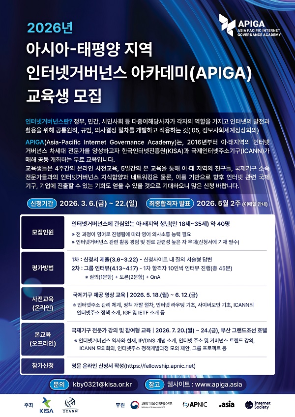 2026년 아시아-태평양 지역 인터넷거버넌스 아카데미(APIGA) 참석자 모집(~3.22)