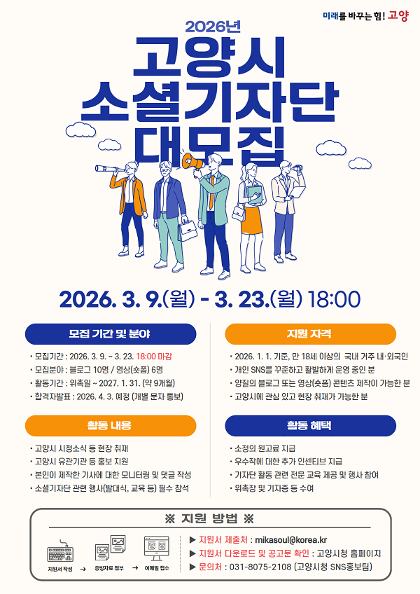 - 문의 : 고양시청 언론홍보담당관 SNS홍보팀 (☎031-8075-2108)