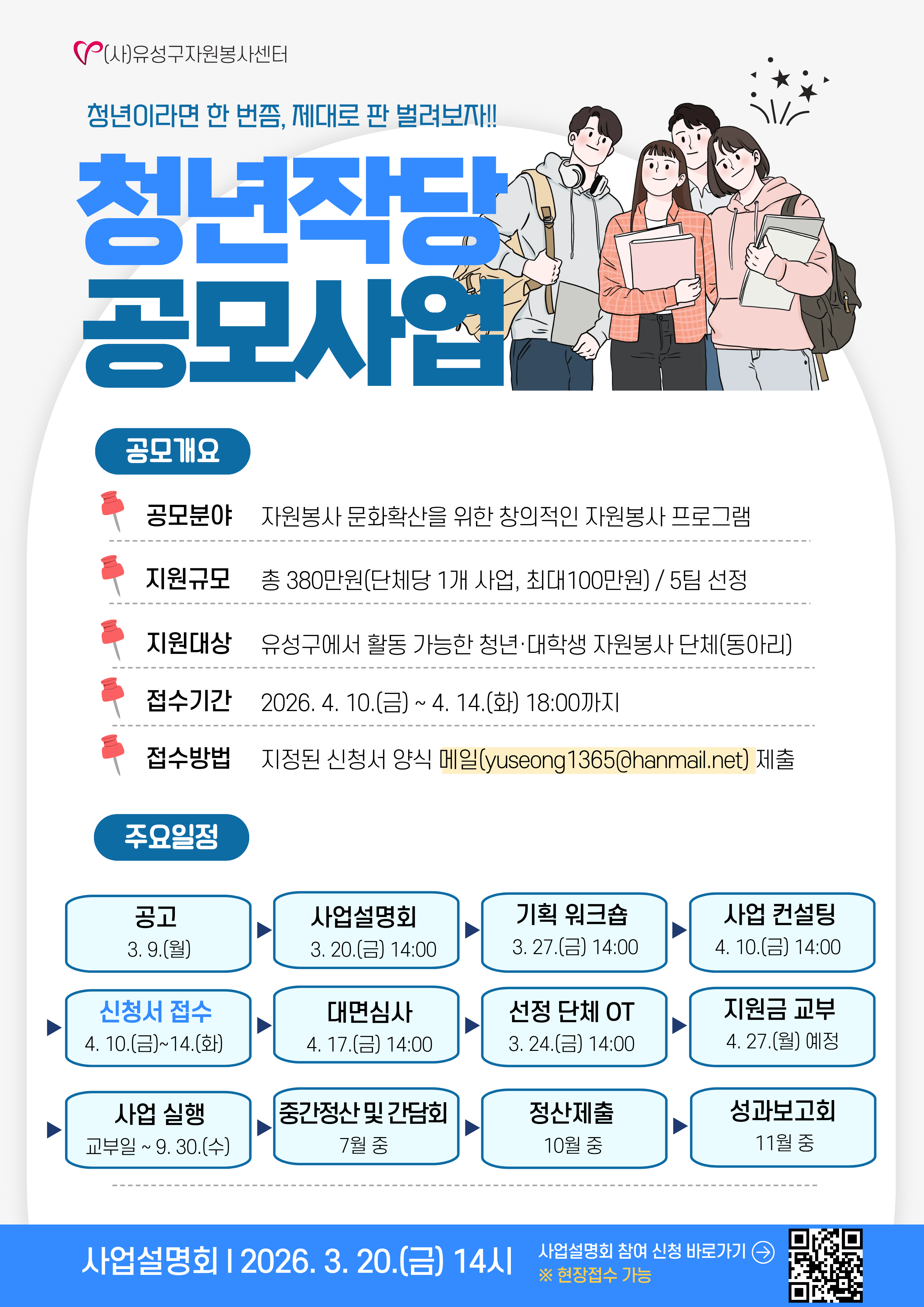- 지원 대상 : 유성구 지역에서 활동 가능한 청년·대학생 자원봉사 단체(동아리)