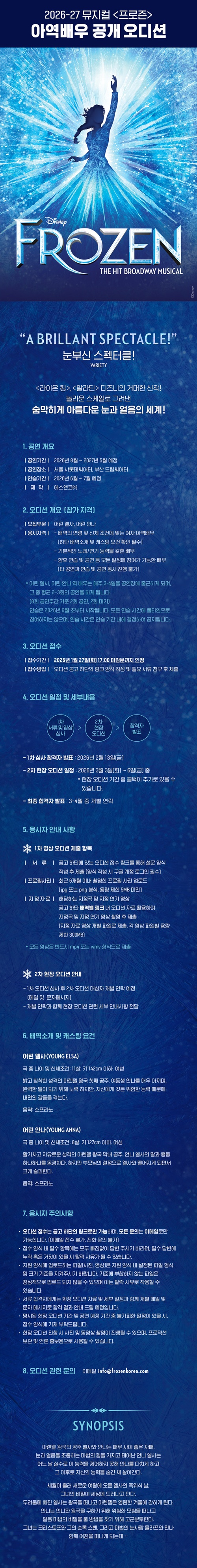 * 어린 엘사, 어린 안나 역 배우는 매주 3-4일을 공연장에 출근하게 되며, 그 중 평균 2-3회의 공연을 하게 됩니다.